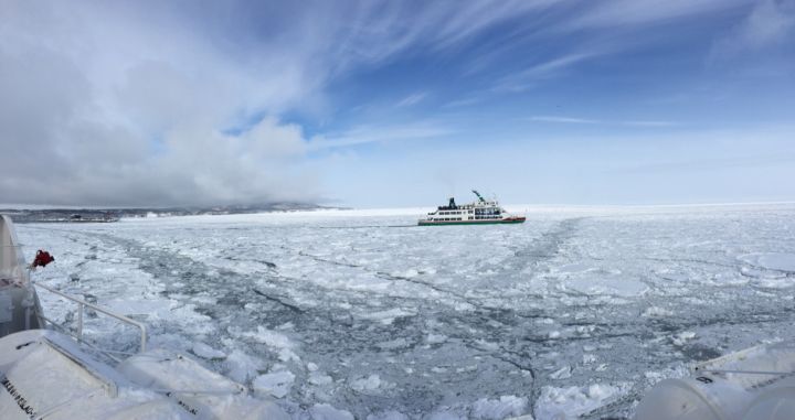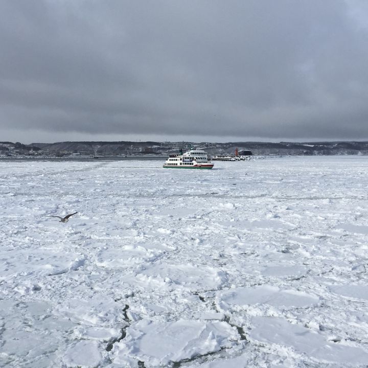 这个船大概会在冰面航行一小时的往返旅程,全程都有海鸟(不知道品种)相伴,日本游客这时候就会掏出自己的超强单反,对着鸟一阵狂拍,还发出一些不知所云的称赞词汇(丝国以,塔诺西)。而我面无表情地拍着船外景色,是那种读不懂空气的多余角色。